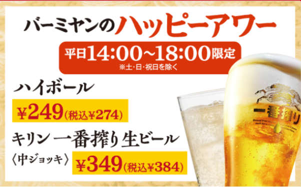 バーミヤンはハッピーアワーを活用した昼飲みがお得!