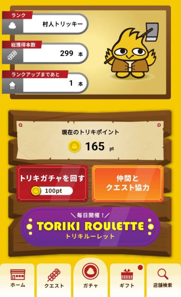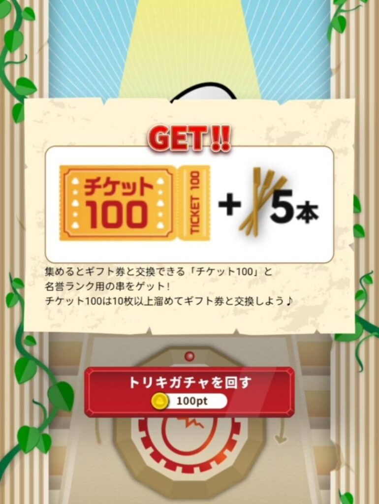 ※トリキルーレットを回すと5~50ポイントがもらえます。100ポイントたまるとトリキガチャが回せて、トリッキーのランクが上がる”串”や、10枚集めると100円ギフト券として使える”チケット100″、100円、300円、1000円のギフト券がもらえます。