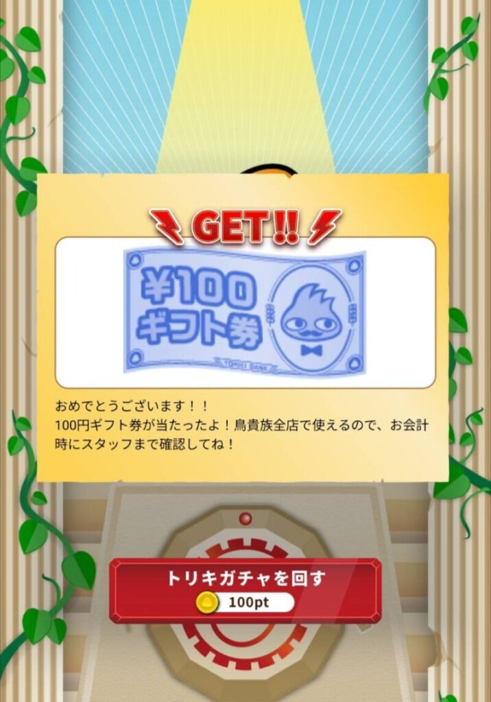 ちなみに“トリキガチャでギフト券当選”は、トリキガチャで極まれに当たる激レアオレンジたまごです!ガチャを70回まわして1回だけ当たりました!!