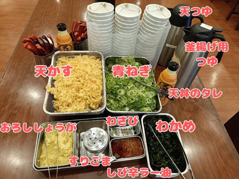 丸亀製麺は無料トッピング、卓上調味料が充実してます。