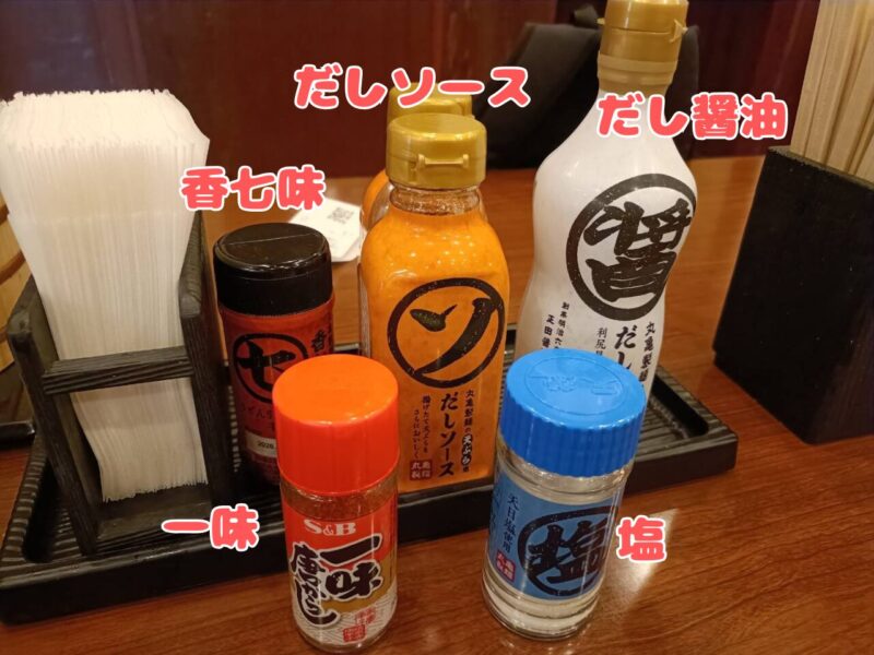 香七味、だしソース、だし醤油、一味、塩。