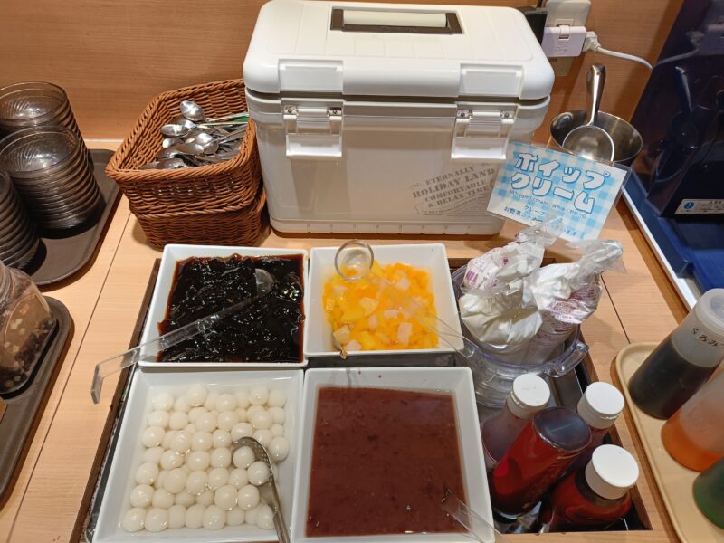 写真を取り忘れましたが、このほかにソフトクリーム、ドライフルーツ、ココアクッキー、コーンフレーク、きなこ、チョコスプレー、自分で作るワッフルやプリンなどもありました!