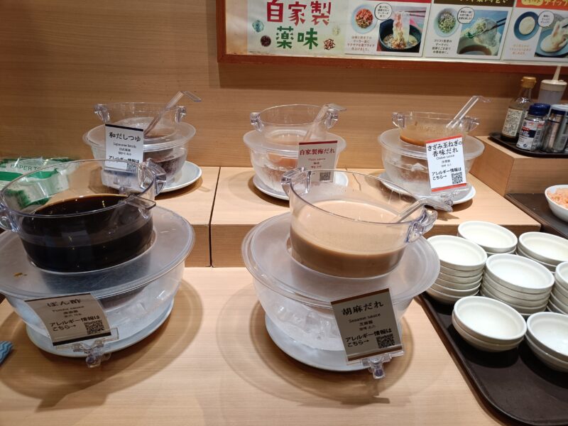 ぽん酢、胡麻だれ、和だしつゆ、自家製梅だれ、きざみ玉ねぎの香味だれ。