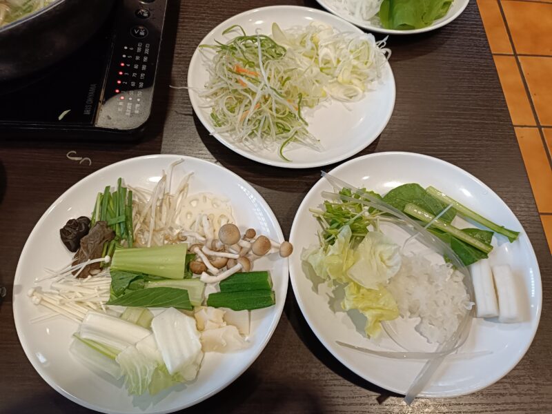 えのき、木綿豆腐、白菜、チンゲン菜、レタス。