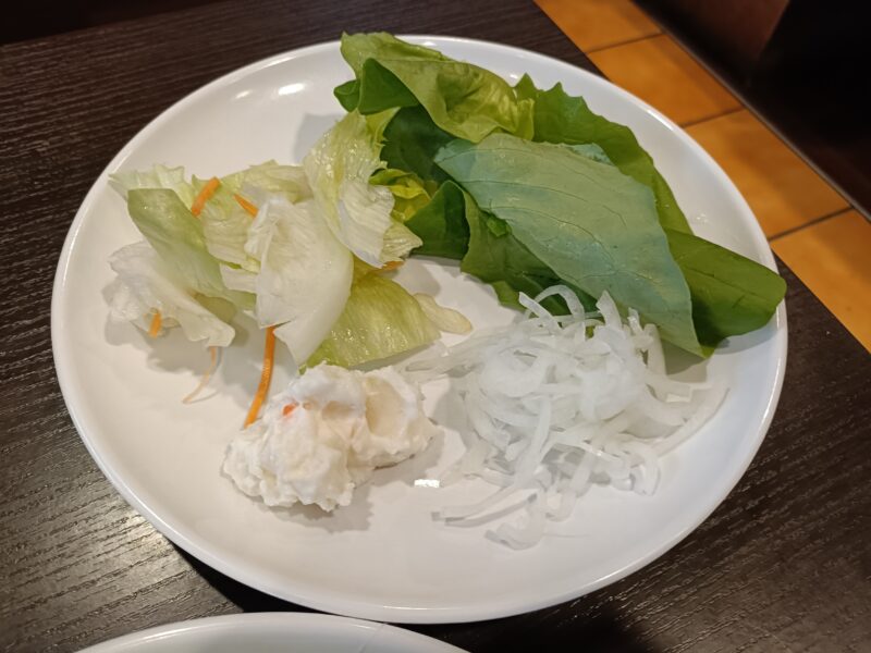 オニオンスライス、サラダレタス、サニーレタス(サラダ菜?)、ポテトサラダ。