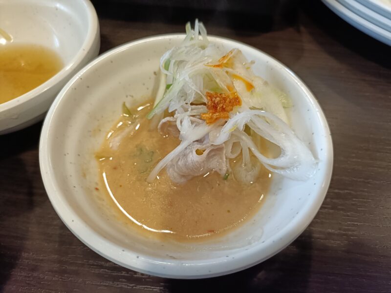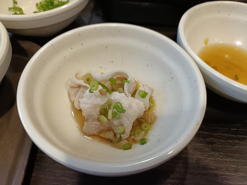今度は豚肉と細笹ねぎに、麻辣油と麻辣醤たれをかける。