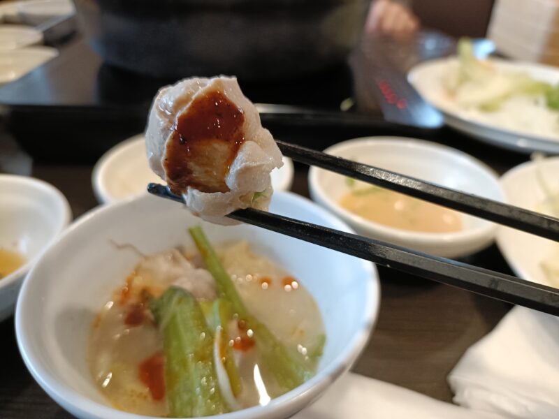 麻辣湯だしでしゃぶしゃぶして、麻辣醤たれをつけて食べてみると、もっちり豚バラが美味しい!