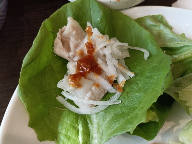 白だしでしゃぶしゃぶしたお肉をサラダ用の野菜で巻いて、オニオンスライスとサムジャンをかけて完成!