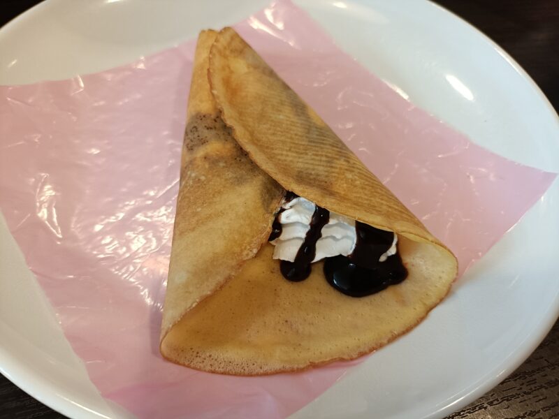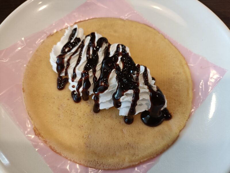 サラダコーナーにあるクレープ生地にホイップをこれでもかとしぼって、チョコレートソースを贅沢にかけまくる!