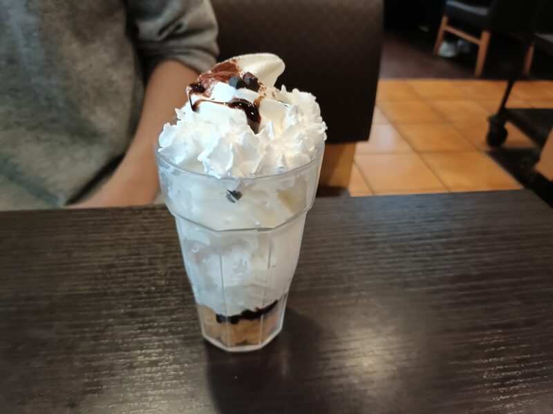 コーンフレークとホイップとソフトクリーム、チョコソースのほぼ白いパフェです。