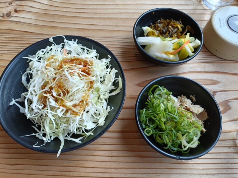ラーメンが来る前にキャベツでベジファができるという珍しいラーメン屋さん。