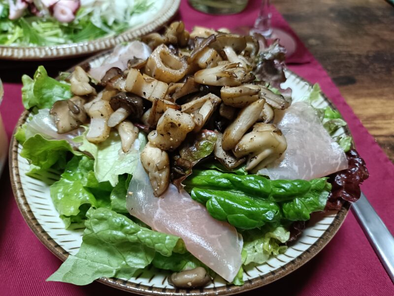 生ハムと塩胡椒で炒めたきのことに塩気を頼んで、あとはこのオリーブオイルをたら~り。