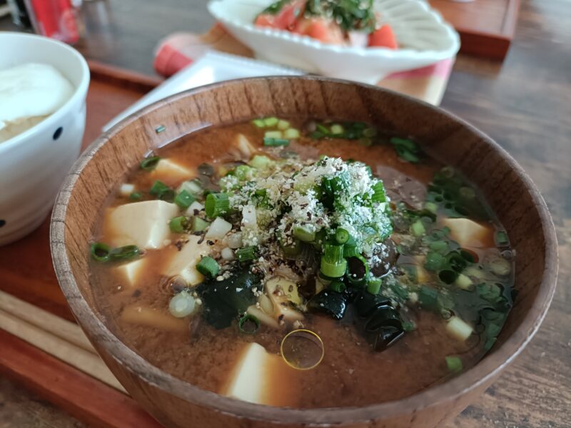 トマトとしめじ、わかめ、豆腐の具だくさん赤だし味噌汁に、粉チーズとブラックペッパーを掛けてオリーブオイルをたらしました。