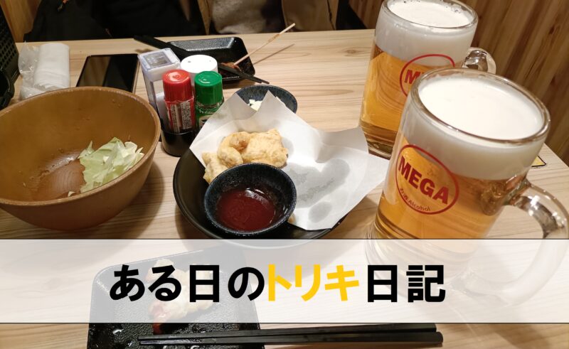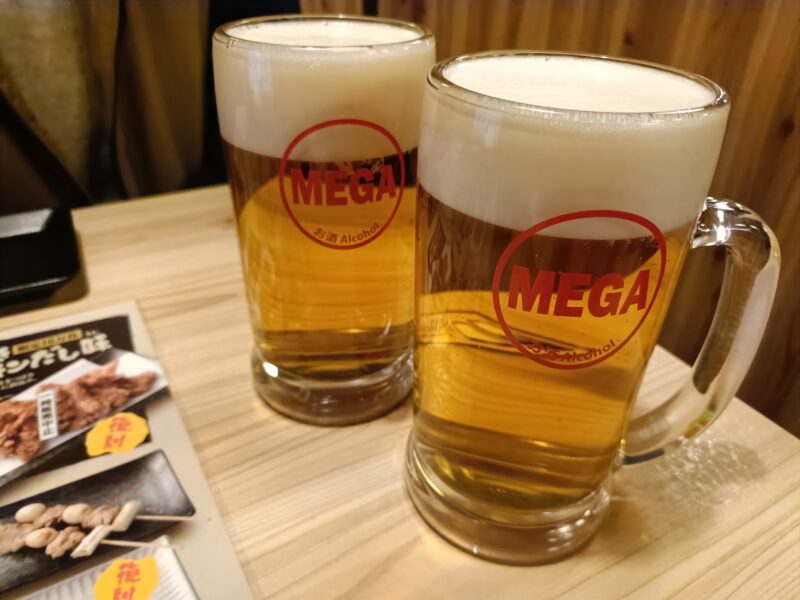 途中のどこかのタイミングでメガ金麦の2杯目を注文していたので、メガ金麦4杯、串4皿(8本)、キャベツ盛、とり天でごちそうさま。