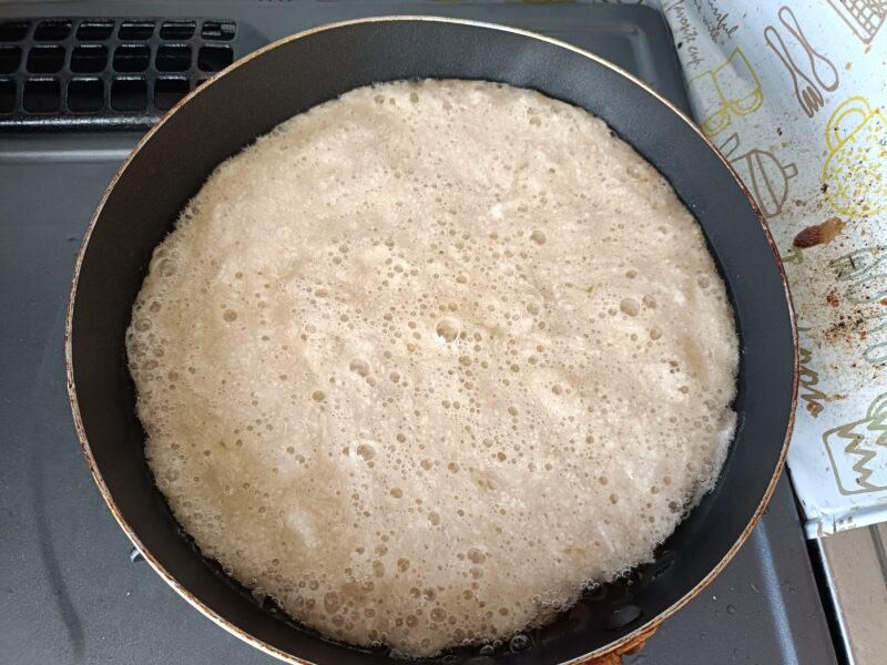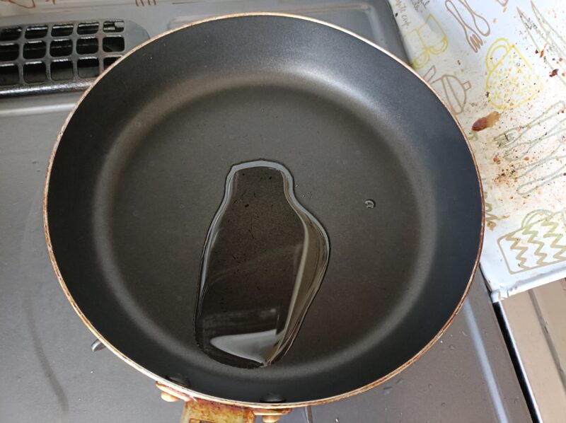 今回は長芋の量が多いので、フライパンのふちまでしっかり油でコーティングしてくっつかないように。