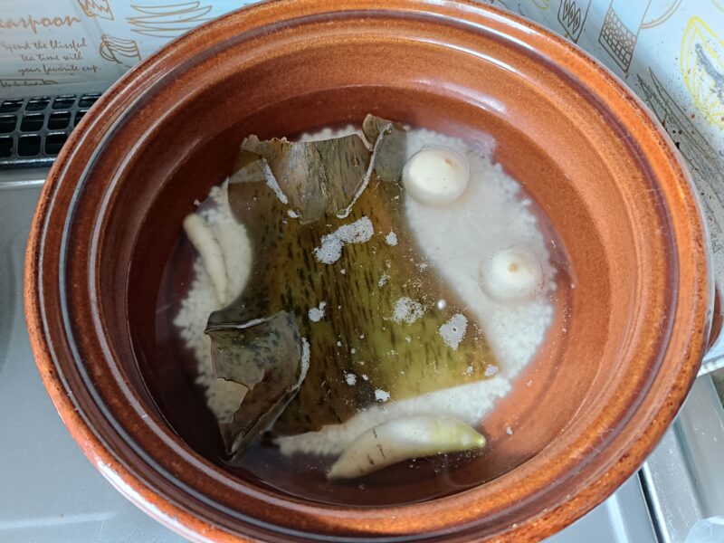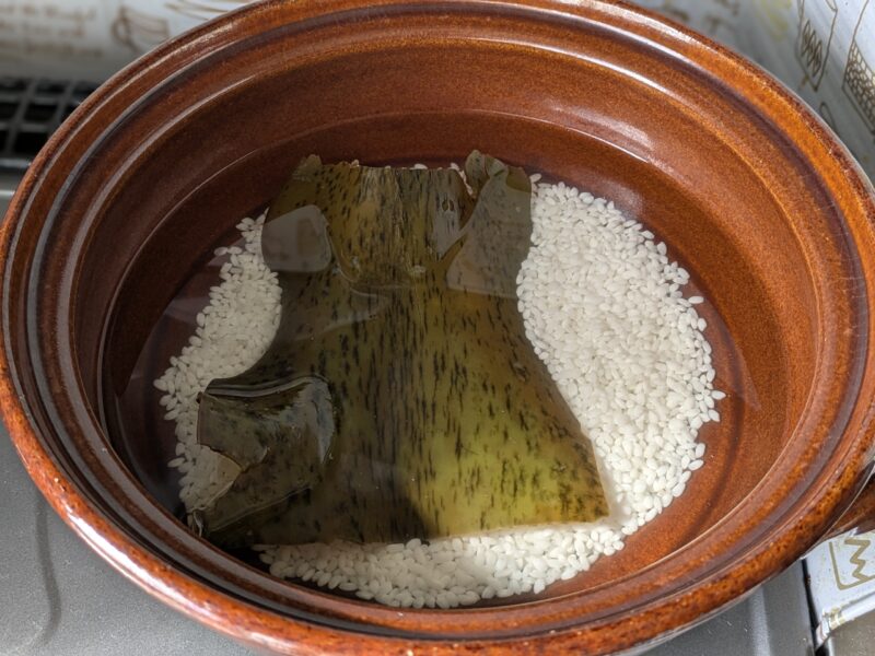 食べる前日の夜、鍋へ水(1Lくらい)と昆布(5㎝くらい)を適当にポイと入れ蓋をする。朝まで放置。