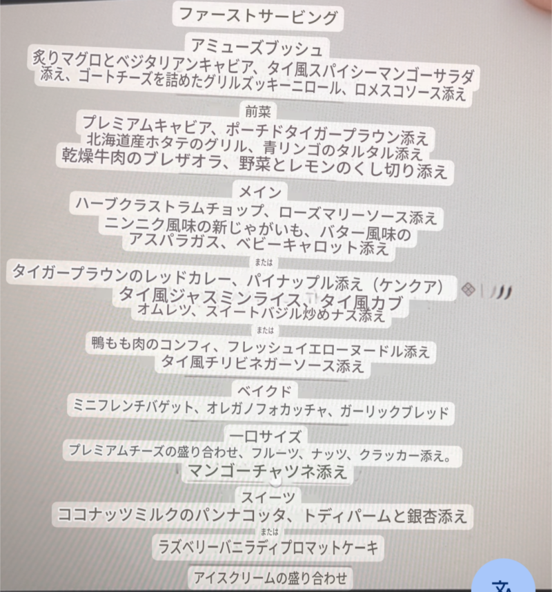 機内食の豪華なコース料理とサービス