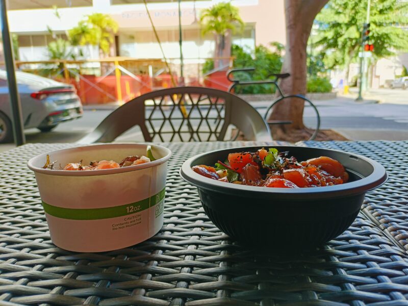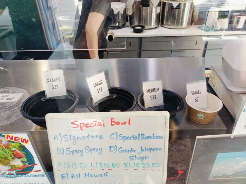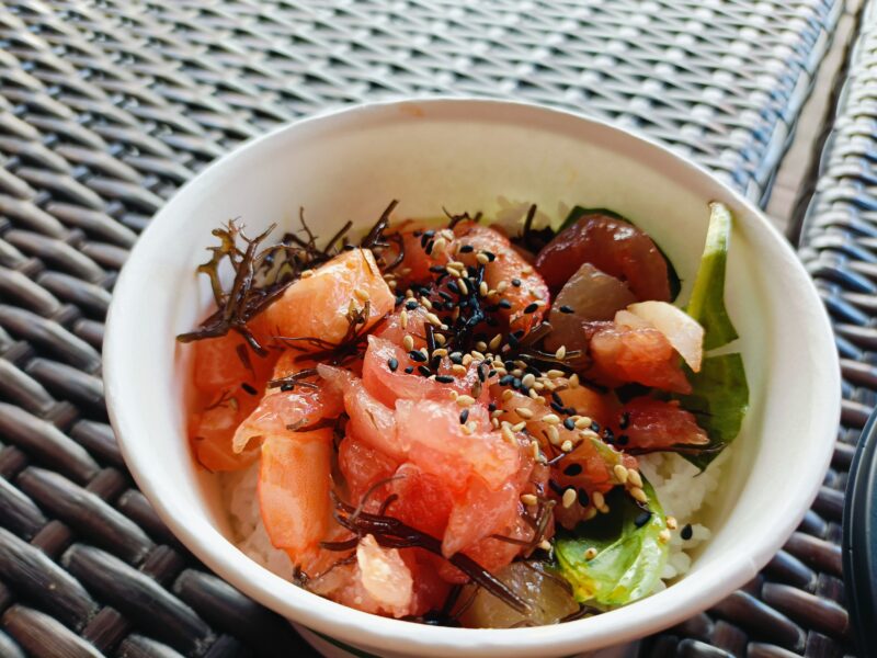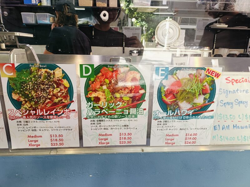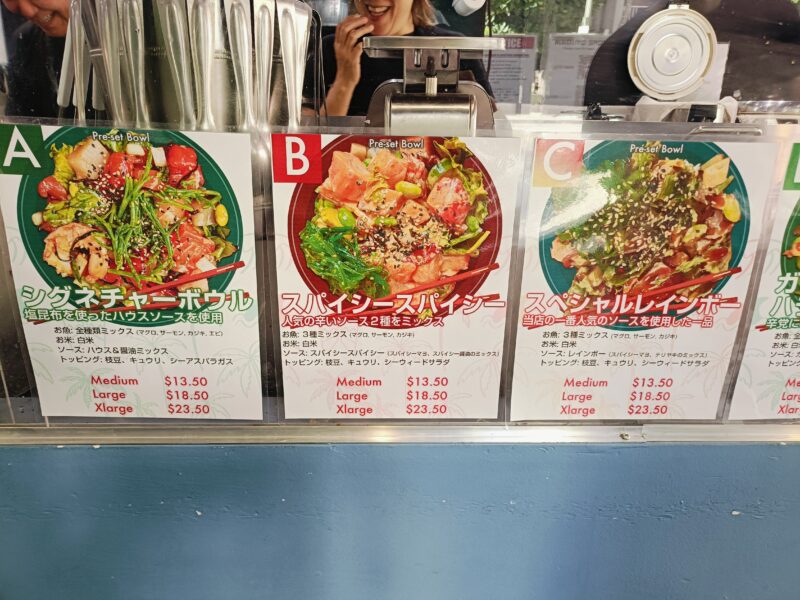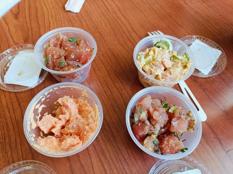 そのあとホテル近くのスーパーのお総菜コーナーにポキを発見したので買ってみる。店員さんにポキの種類と量を伝えて、量ってもらって、バーコードを貼ってもらって、レジでお会計の流れでした。