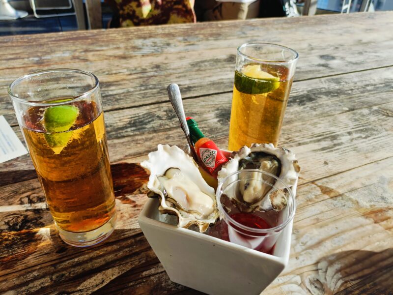 生牡蠣3ドルを2つ、ビール5ドルを2杯、注文してみる。