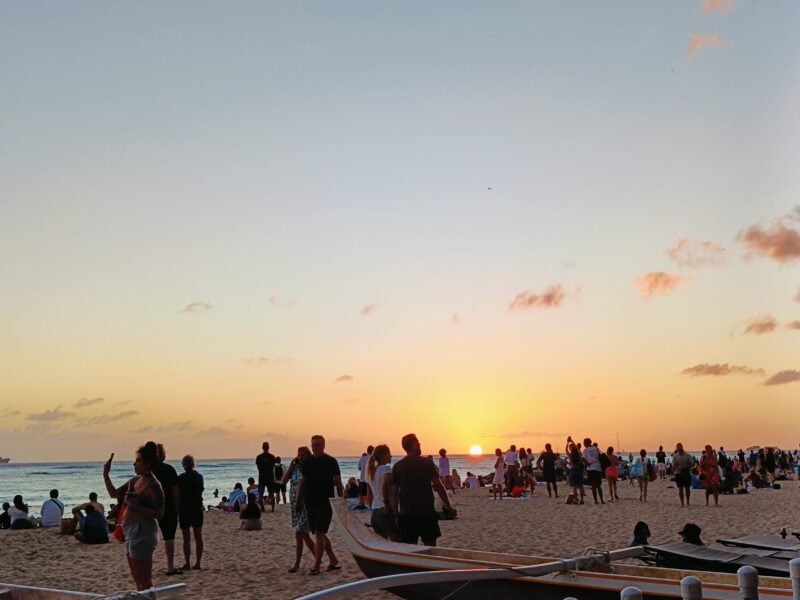 みんな夕日を見にビーチに集まっていて、平和な感じがしました。