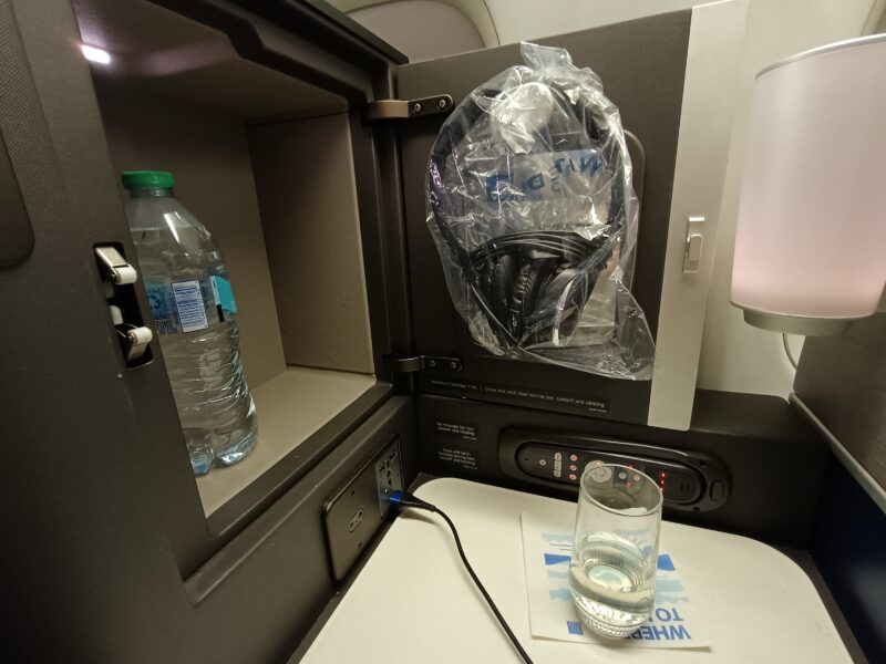 サイドテーブルには、ヘッドフォン、お水、充電用コンセント(全種類対応)、充電用USBポートがあります。