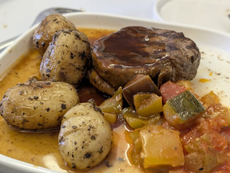 ステーキを切った断面はこんな感じ。さすがに機内だから火が通り切ってる…