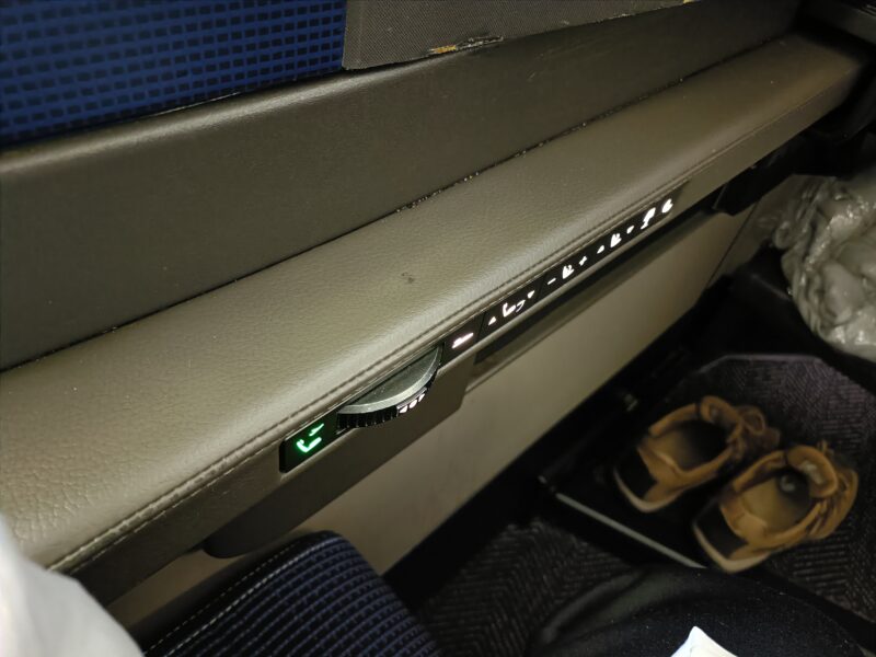 シートのリクライニングは座席横のボタンで操作できます。もちろんフルフラットになる!