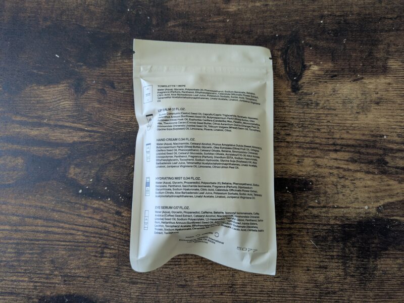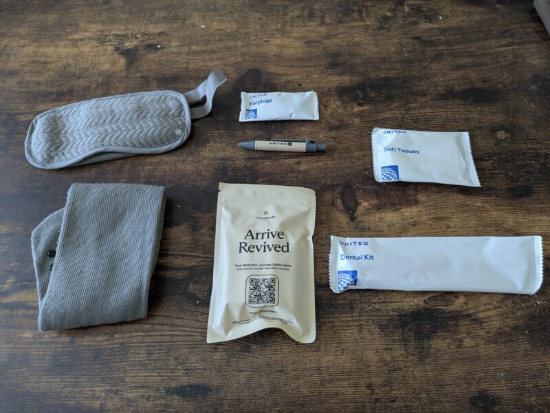 アイマスク、耳栓、ミニペン、お手拭き、機内用靴下、スキンケアセット、歯磨きセットが入ってます。