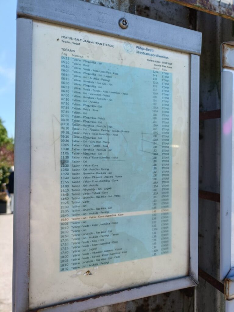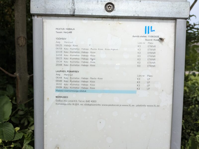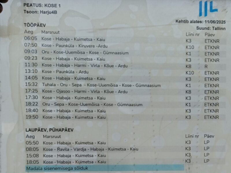 K3番バス(Habaja→Kose)はこれだけです。土日は1日4本しかないです。