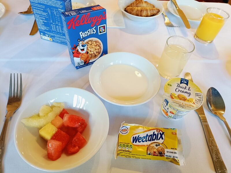最初、ビュッフェだけかと思ってコーンフロスティとかフルーツ、ヨーグルトとか色々選んでしまいました。食べきれるのか!?