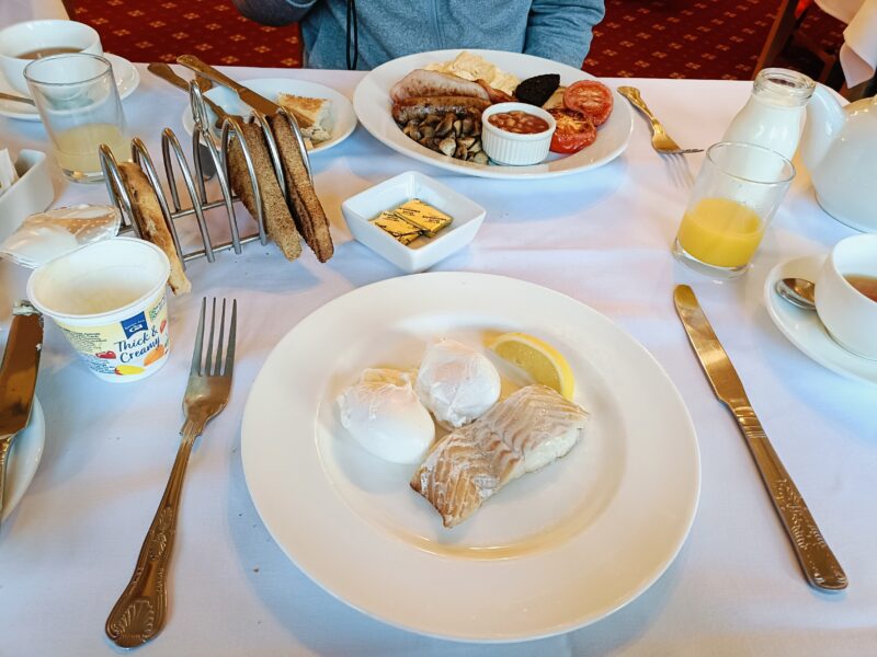 燻製鱈とポーチドエッグ、イングリッシュブレックファストに比べると見た目は超すっきり。(ちょっと寂しい)