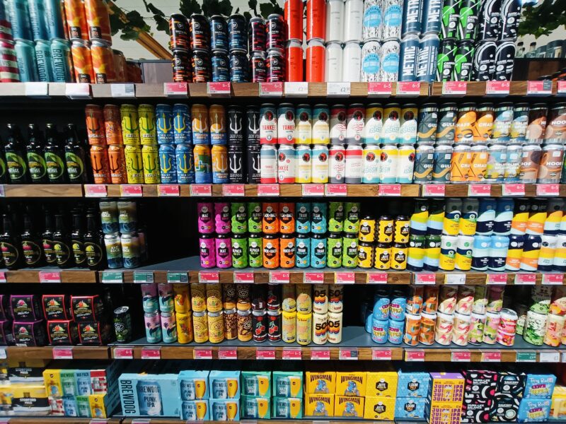 スーパーのお酒の棚がすごい!種類もいっぱいあって、全部カラフル!