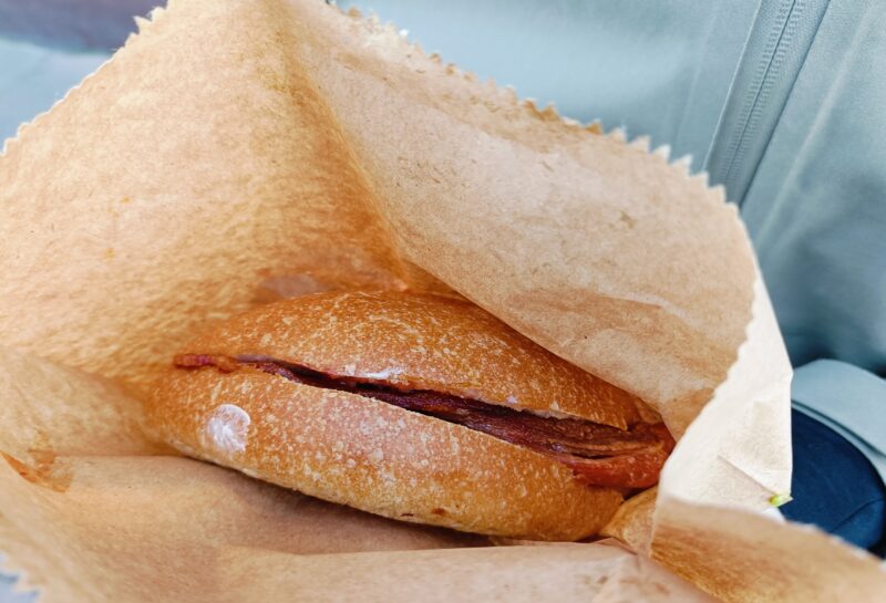 ちょっとベーグルっぽいパンにベーコンとケチャップ、バターを挟んであって、おいしい!特にこのパンが噛めば噛むほど味がして旨い!