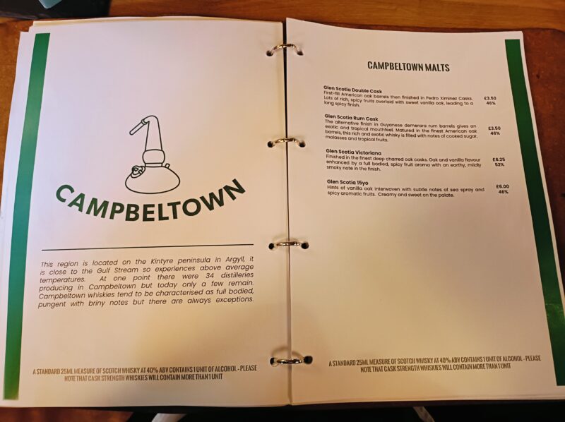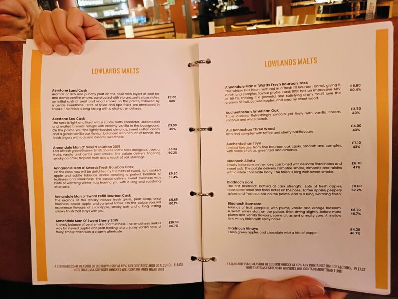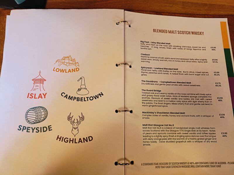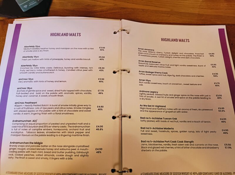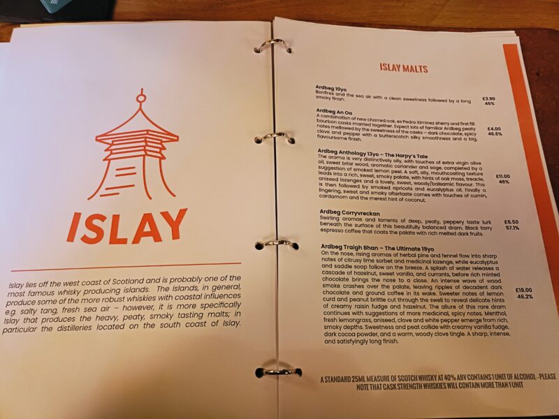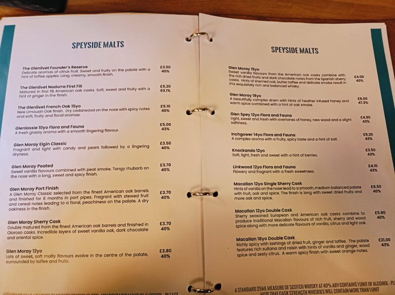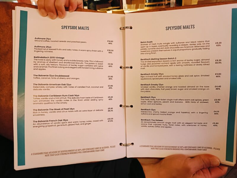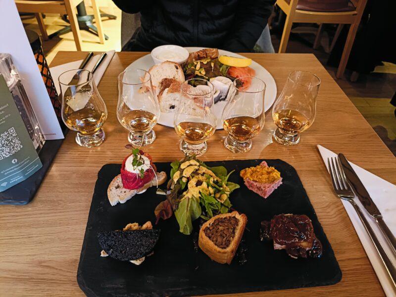 ウイスキー5種類、タパスの盛り合わせ、魚のプレートで約40ポンド。