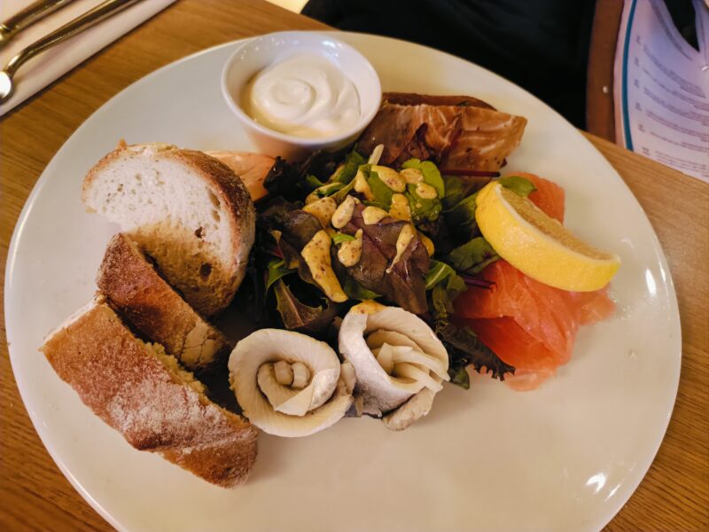 パンから右回りにボイルしたキングシュリンプ、レモンクリーム、鯖の燻製、スコットランド産スモークサーモン、オークランド産甘酢ニシン。真ん中はサラダ。