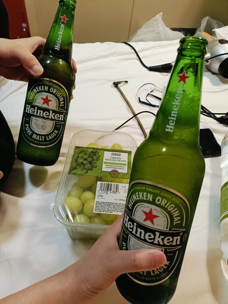 シャワーあびて、帰りすがらTESCOで買ったビールとマスカットで一杯。