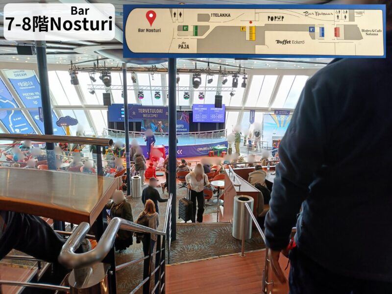 Bar Nosturiは7-8階で吹き抜けになってて解放的。段になってて荷物が多いと大変そう。
