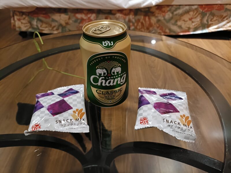 寝る前にチャーンビールと機内でもらったスナックミックスで1杯。