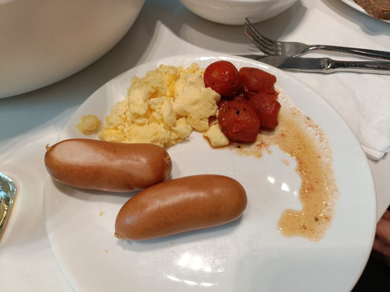 朝食メニューから、スクランブルエッグと焼いたミニトマト、ウインナー!
